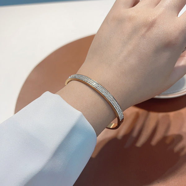 This contemporary bracelet for women features a durable stainless steel base with a sophisticated rose gold plating. Its design showcases three elegant lines adorned with sparkling American diamonds, combining modern style with timeless shine. Perfect for adding a refined touch to any outfit, this bracelet offers both lasting quality and exquisite craftsmanship.